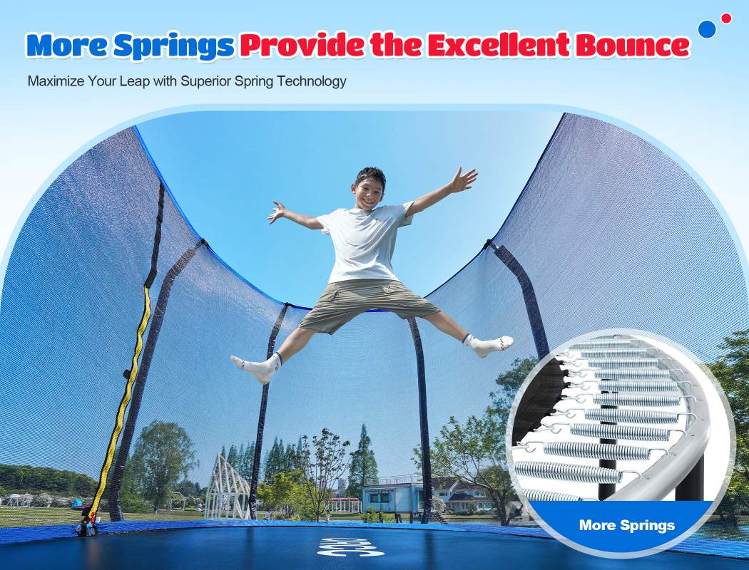 【Safer Structure】The ORCC trampoline features curved and thickened foam-wrapped safety poles, which increase the distance between jumpers and safety poles to prevent injuries caused by collision. Additionally, trampolines with curved safety poles provide better stability to the structure and it is not easy to roll over during the jumping process. Moreover, the reinforced safety net provides better support and can firmly hold the jumper.